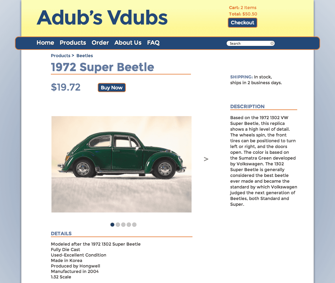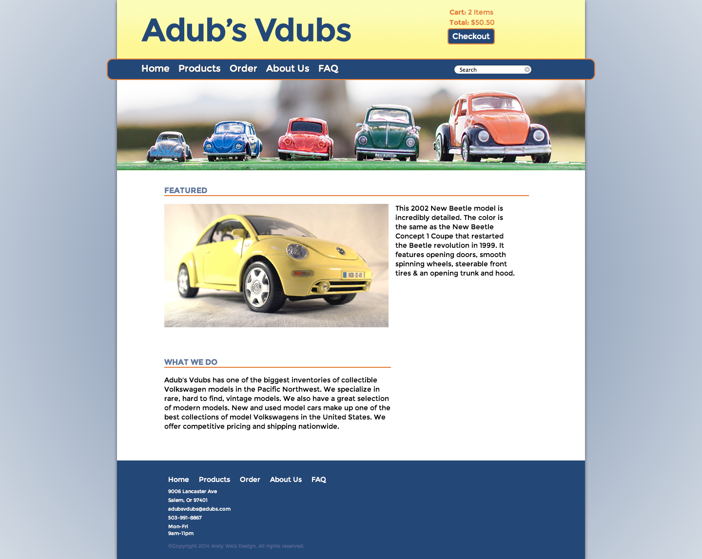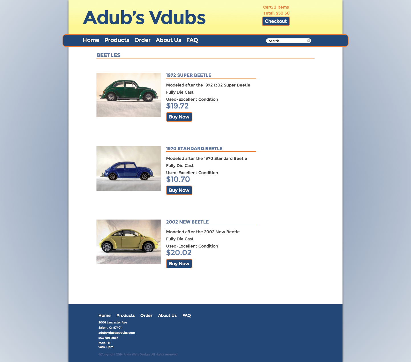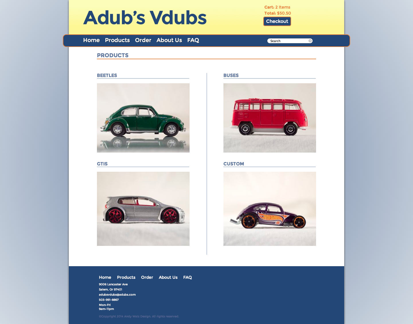 Adub's Vdubs is a fictional e-commerce company that sells model Volkswagens. Their site needed to reflect the style of their products. The layout is clean and efficient and the colors are quirky and fun.